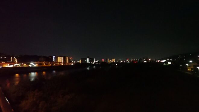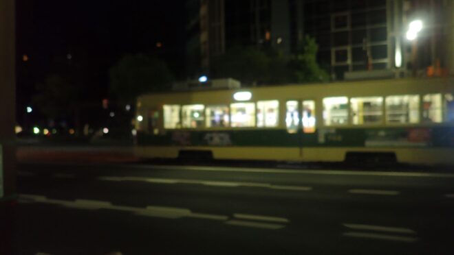 夜景モードにしたままだったのでボケボケですが市内電車は既に動き始めていました。