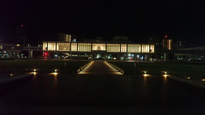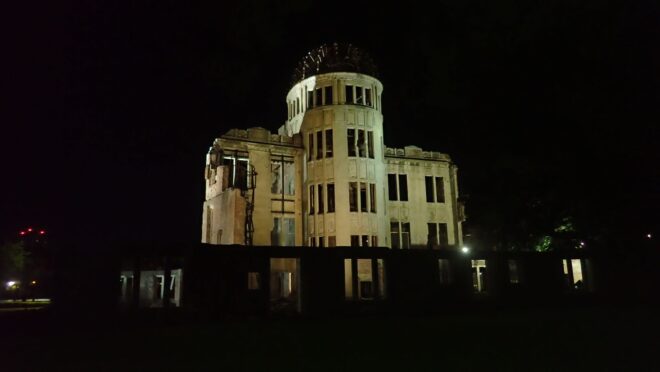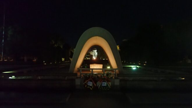 原爆ドームのふもとに見えるのが平和の灯