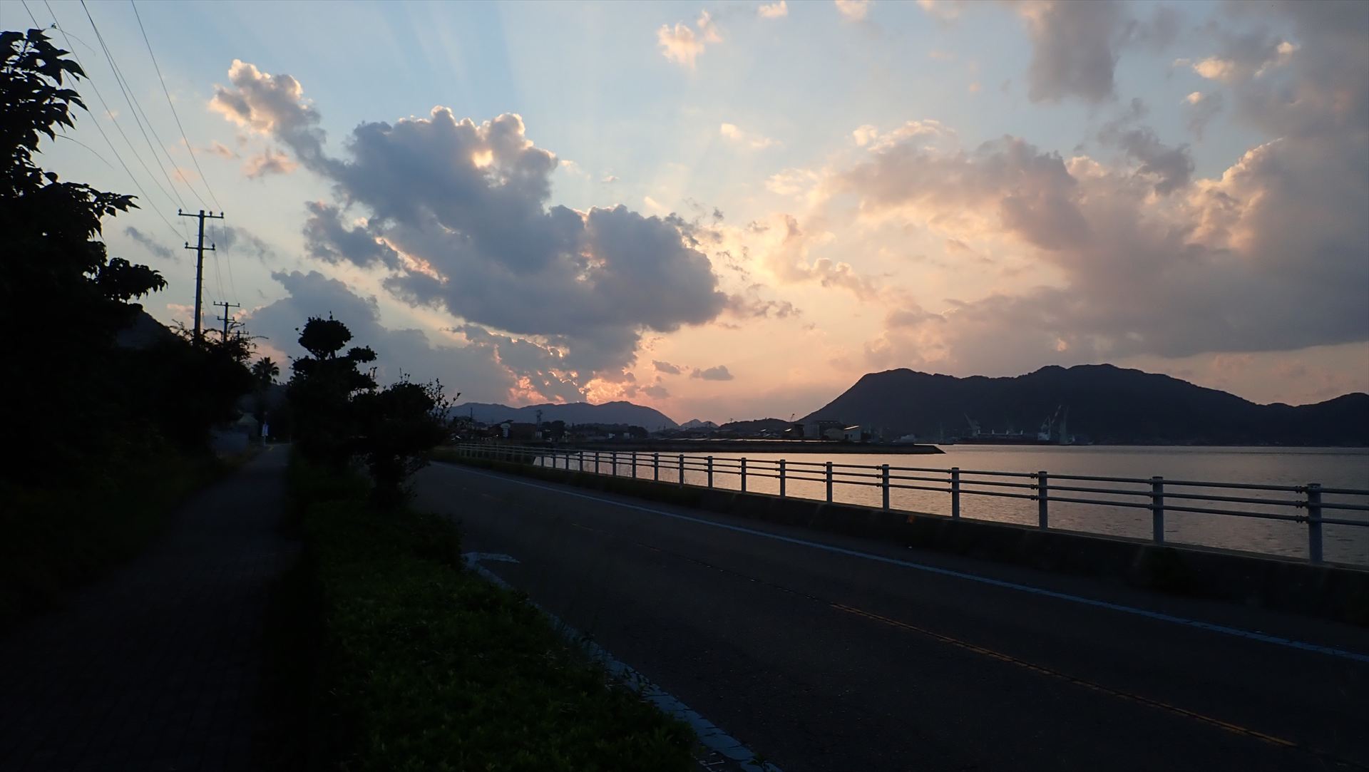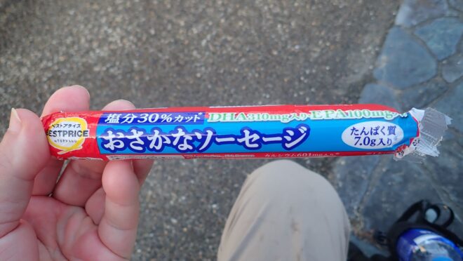 西國街道と夕暮れの瀬戸内海ロングウォーキングで貰ったソーセージ