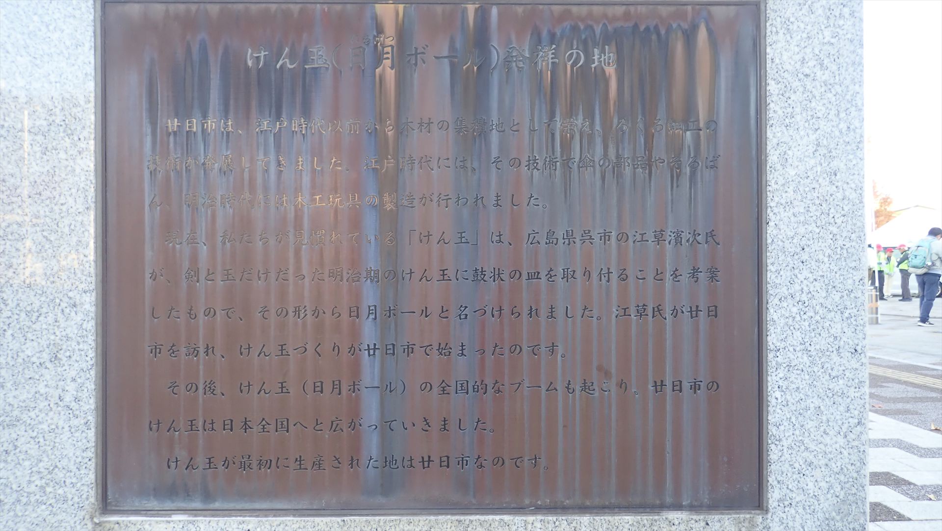「日月ボール」の考案者である江草濱次(えぐさはまじ)は、木工ろくろ技術と木工玩具の生産地として有名な廿日市を訪れ、製造を依頼し、以後、廿日市で作られた多くのけん玉が、けん玉文化をつくりあげてきました。