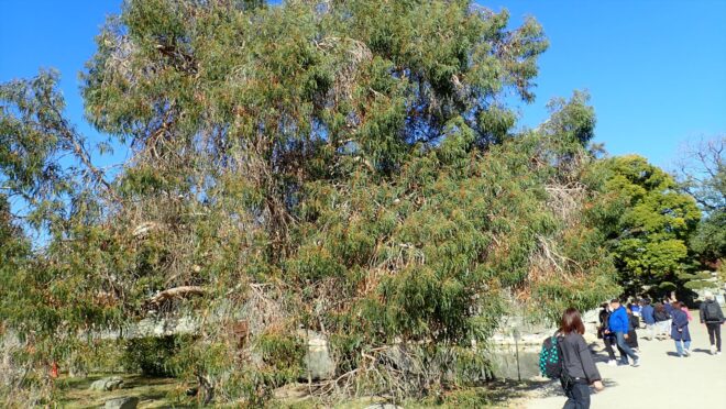 爆心地から740m離れた広島城の城跡にある、被爆樹木です。マルバヤナギは、幹の中が空洞になりながらも、樹木医の治療を受けて元気に育っています。少し離れた場所に、中沢啓治さんの漫画、「ユーカリの木の下で」の題材になった、樹高10m、幹周2.75mのユーカリがあります。このユーカリは被爆後の黒こげになった姿が写真に残されています。