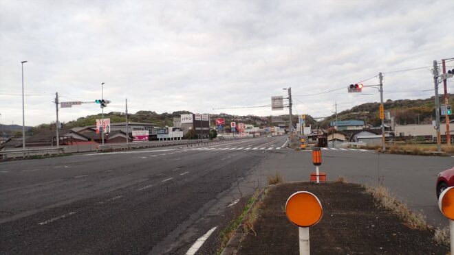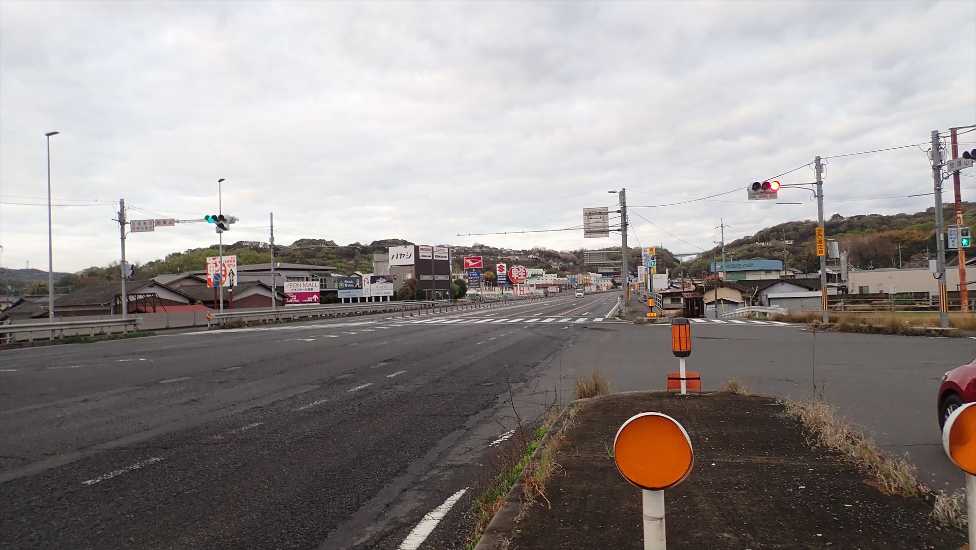 右端に写っている車が赤信号なのにじわじわ進んでいて、最終的に信号が変わる前に二号線を右折していった。